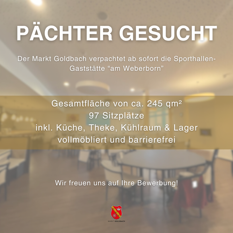 Markt Goldbach, Liegenschaftsverwaltung, Kennwort „Bewerbung Sporthallen-Gaststätte“, Sachsenhausen 19, 63773 Goldbach.
